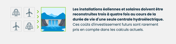 En revanche, la plupart des installations éoliennes et solaires ont une durée de vie de 20 à 30 ans. Durant cette période, chaque centrale hydroélectrique de ce type doit être reconstruite trois ou quatre fois pour fournir le même service à long terme. Ces futures remises à neuf représentent des coûts réels. Elles impliquent de nouvelles constructions, de nouveaux matériaux, de la nouvelle main-d’œuvre et de nouveaux capitaux. Pourtant, de nombreuses comparaisons de coûts présentées dans les médias se concentrent sur les coûts initiaux des projets, plutôt que sur le cycle complet intégrant les réinvestissements nécessaires au fil du temps.