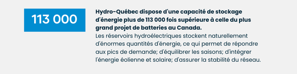 Dans ce contexte, l’hydroélectricité joue un rôle unique. Les grands réservoirs emmagasinent d’énormes quantités d’énergie, offrant une flexibilité qu’aucune autre technologie propre ne peut égaler. Par exemple, Hydro-Québec dispose à elle seule d’une capacité de stockage d’énergie 113 000 fois supérieure à celle du plus grand projet de batteries au Canada.