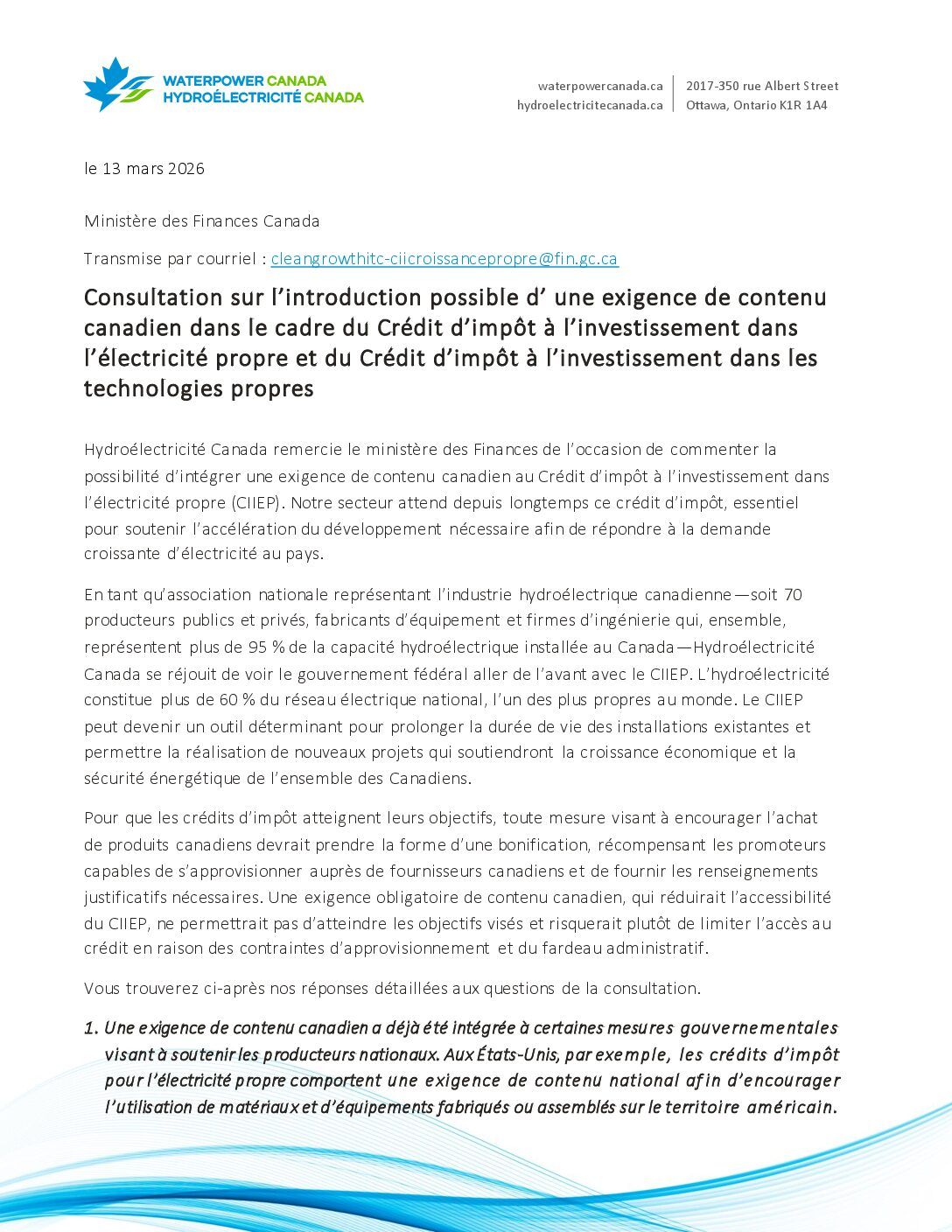 Commentaires de l’industrie de l’hydroélectricité nécessitant une attention immédiate en ce qui concerne le cadre proposé pour les crédits d’impôt pour l’électricité propre dans le projet de loi C-15
